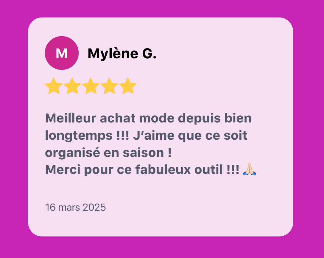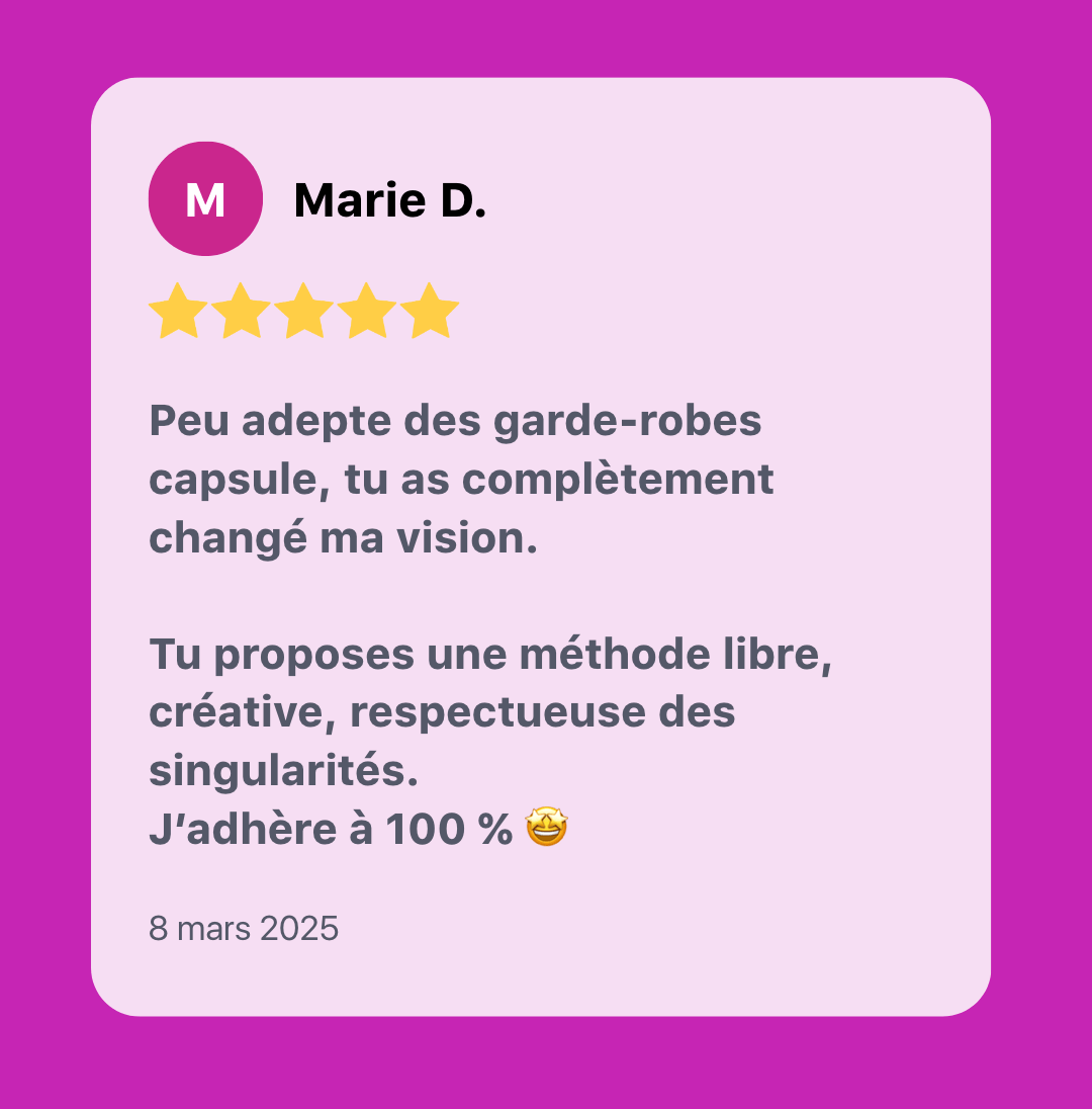 ✅ Avec ma méthode, on construit autour de ce que tu adores, tu mets simplement le reste hors de vue pour y revenir quand tu veux, et tu construis pas à pas ton vestiaire idéal, sans jamais prendre le moindre risque de regret.