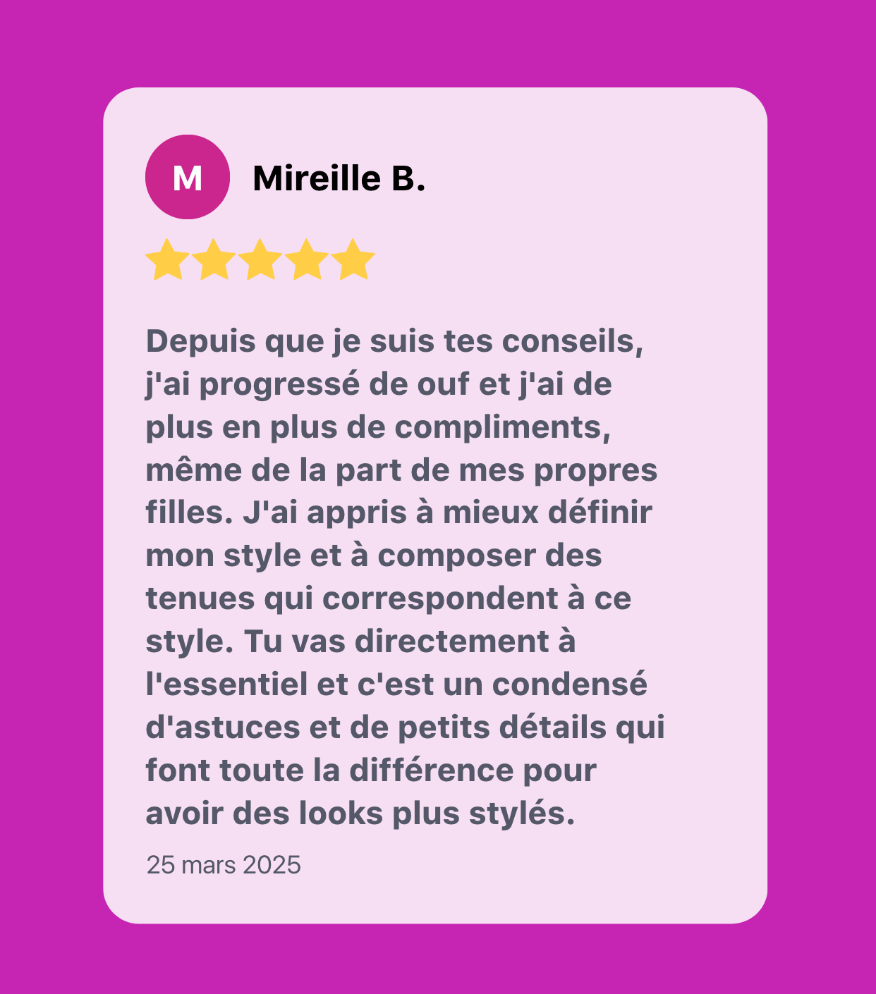 Les deux erreurs que 99% des femmes font, et qui les enferment dans des looks fades et passe-partout. Tu découvres pourquoi le style ne s’achète pas, mais se crée en osant. Tu lèves les blocages invisibles qui t’empêchent de t’habiller comme tu en rêves, et tu apprends à contourner tes propres freins.