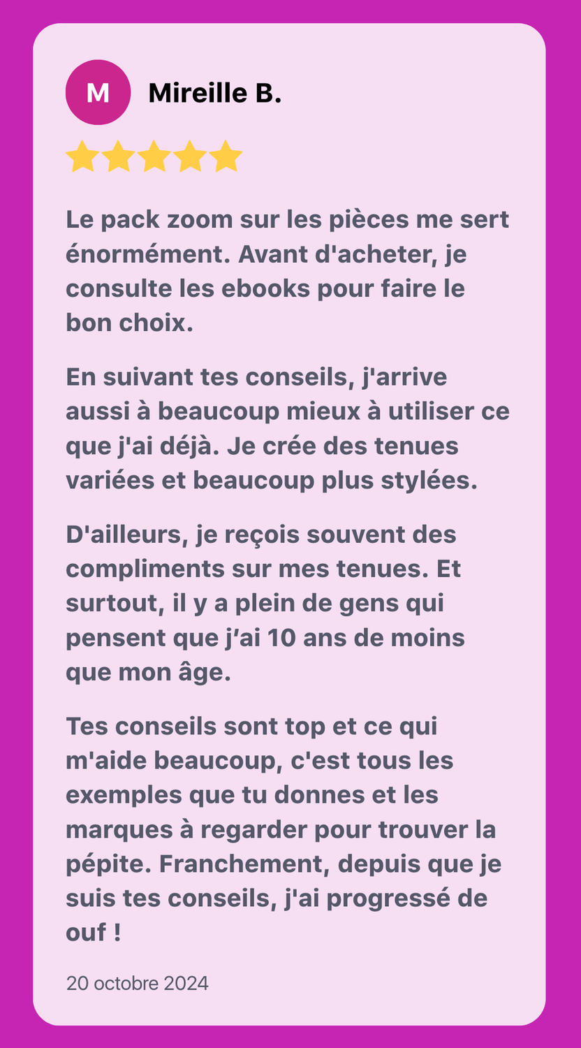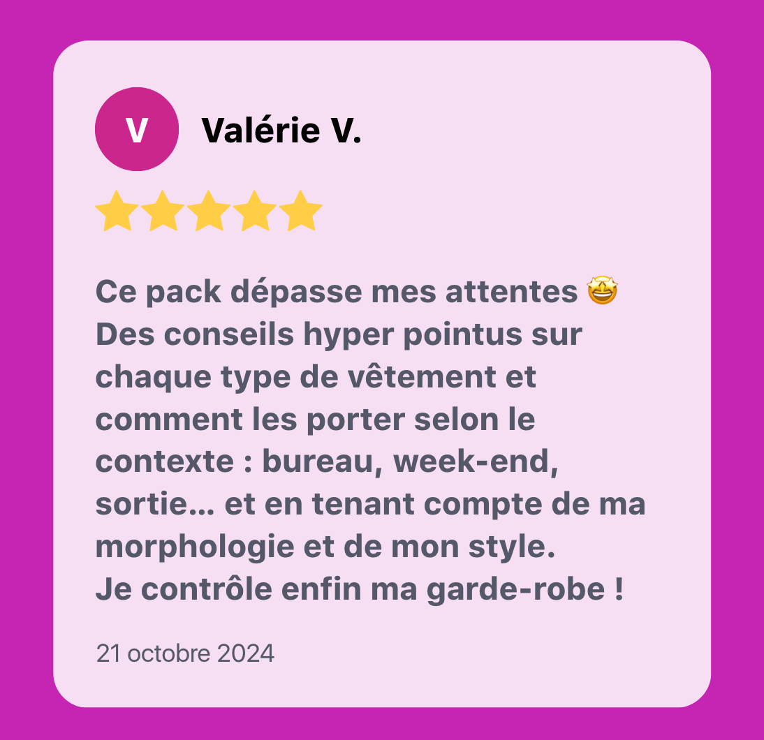 Tu découvres comment chaque vêtement de ton dressing peut travailler pour ton style : fini les pièces inutiles, les achats ratés, juste un dressing efficace et stylé.
