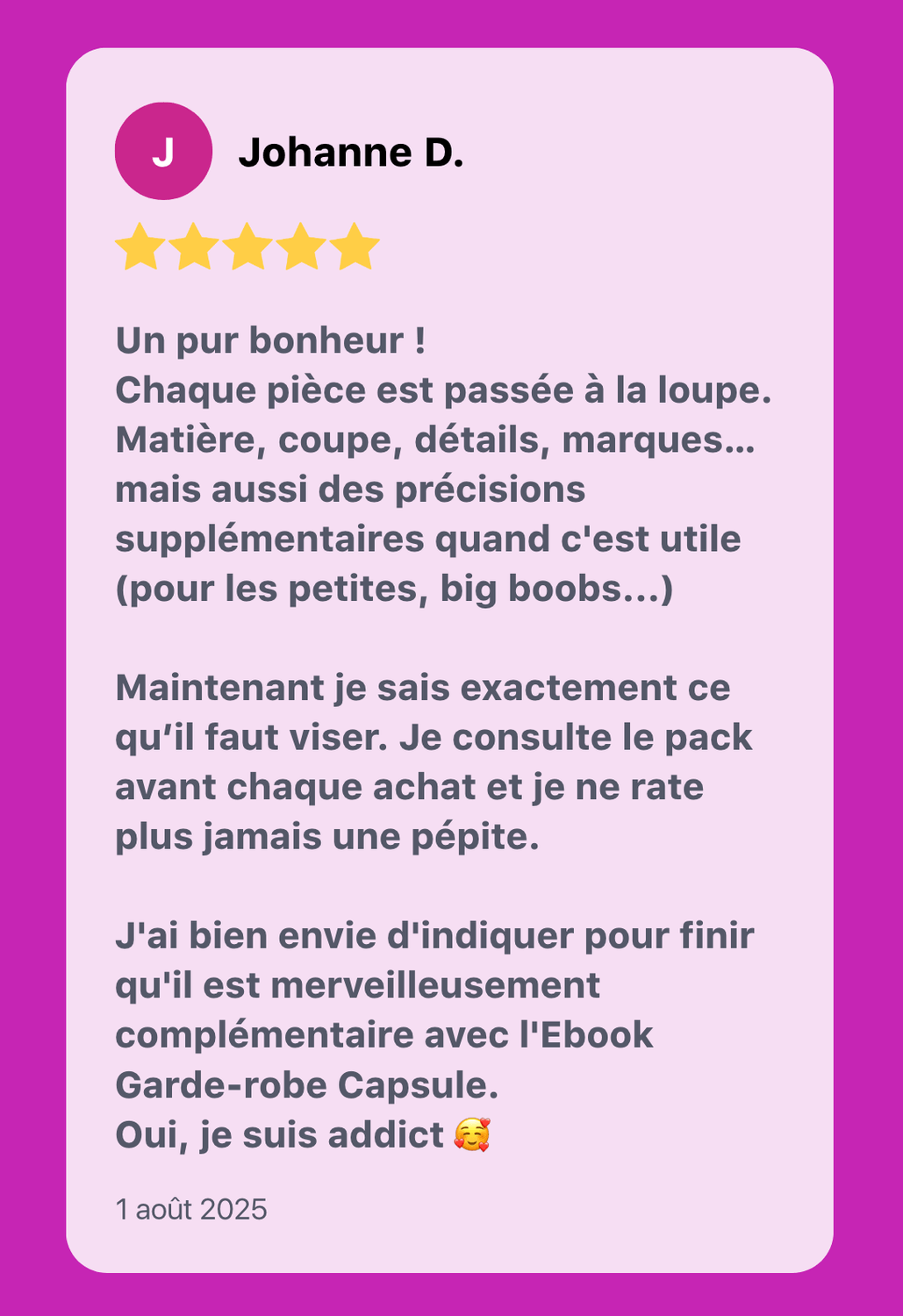Tu utilises des repères fiables : des fiches silhouette, des guides couleur, et des marques chouchou testées et approuvées, pour acheter sans jamais douter.